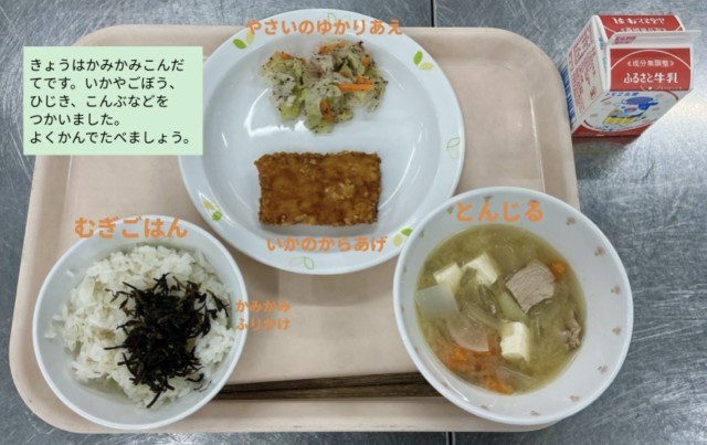 今日はかみかみ献立です。イカやごぼう、ひじき、昆布などを使いました。