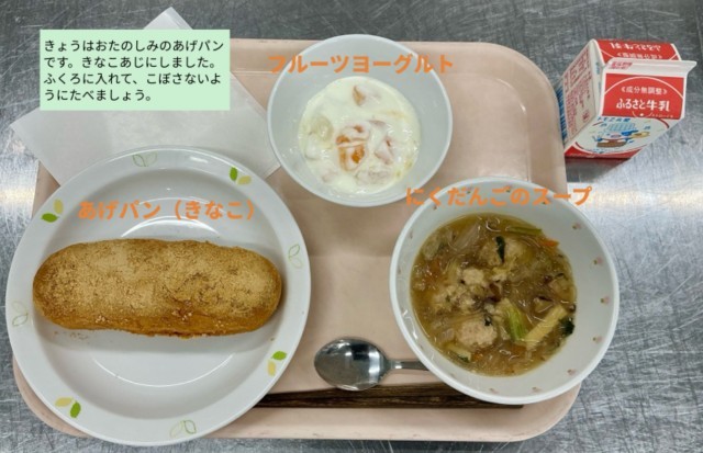 今日はお楽しみの揚げパンです。今回はきなこ味です。揚げたコッペパンに砂糖ときなこを合わせたものを