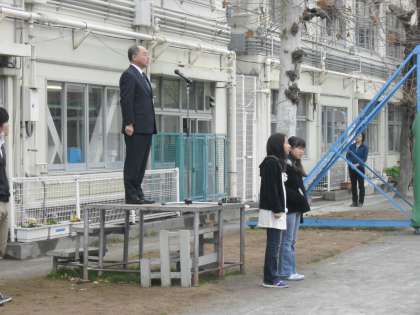 朝会では、校庭でしっかりお話を聞いている子どもたちです。