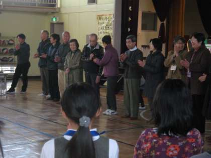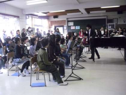 世田谷区内の音楽の先生が50人以上参観し、子どもたちは少し緊張していました。