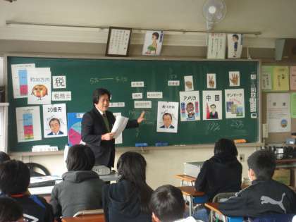 6年の授業で、税理士会玉川支部の方をお招きし、「税金のはたらき」(種類や使い道)について、お話をいただきました。