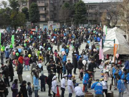 くす玉割りやマラソン、餅つき、演奏、和太鼓、そしてたくさんのお店です。