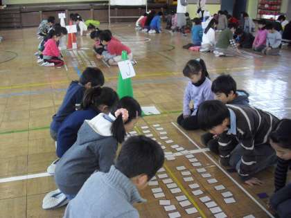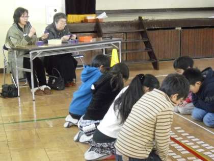 読み手をつとめてくださった地域の近岡さん、入月さんの流れるような読みで、大会の気分は盛り上がり、子どもたちは真剣になりました。なかには上の句を聞いただけで、札をとる子もいます。たくさん札をとった子に贈られる個人賞10人中8人は4年生でした。