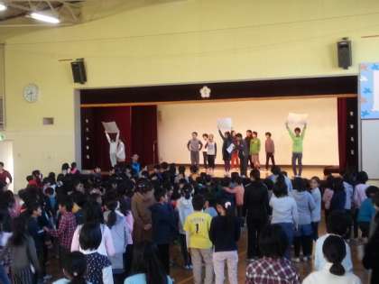 集会委員会による児童集会がありました。○×クイズです。集会委員の子どもたちの説明は、とても聞きやすかったと思います。1年の間に、力をつけてきたことが分かります。 -
