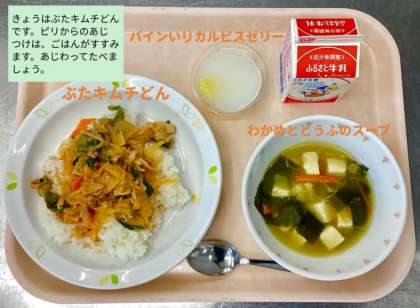 給食の豚キムチ丼は、全学年が食べられる、ほどよい辛さです。
