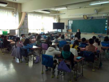 今年度もすべての学年、学級で、「お話の小部屋」を実施していただいています。「お話の小部屋」とは、地域の方々が、本の読み聞かせや素話などを行ってくださる取組です。子どもたちは、その語りのすばらしさで、お話の世界に引き込まれて集中して聞いています。