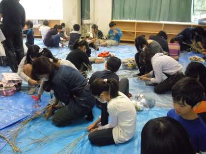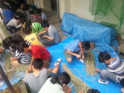 用意していだたいたきなこやあんこで、おいしく食べました。また、稲わらを活用して、縄をつくりました。