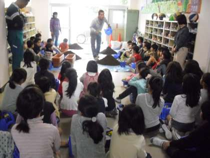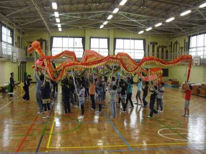 雨のため体育館で行ったので、実際よりコンパクトな動きになっていますが、色とりどりの大蛇が、子どもたちの手によって動かされると、華やかなものです。