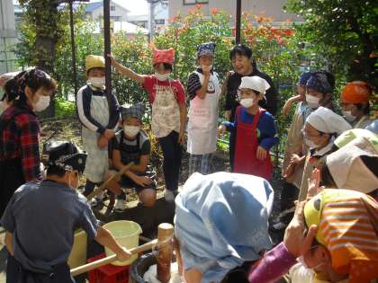 今日は、朝早くから地域の方々や保護者の方々にご協力いただき、もちつきをしました。