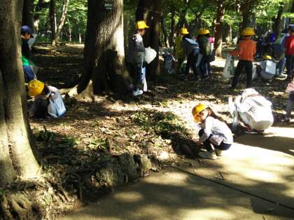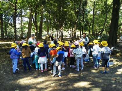 1・2年生が、林試の森に秋を探しに行きました。地域環境学習プロジェクトのみなさんが、秋の自然を活かした体験活動を用意してくださいました。1年生と2年生が1つのグループになり、どんぐりを拾ったり、お弁当いただいたりしながら、たくさんの秋を見付けて来ました。
