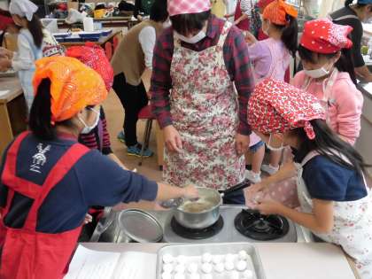 前学校運営委員の福島展子さんに講師をお願いし、そのご指導のもと、参加した子どもたちは手作りのお団子をつくりました。団子を丸める手ざわりのよさなどつくって楽しく、食べておいしく、子どもたちと関係者の大人の方々も堪能していました。