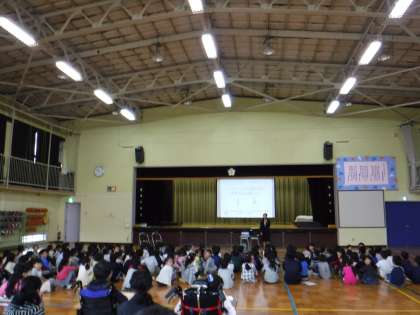 1,2年生が消化・吸収・排泄についての話を聞きました。早寝、早起き、朝ごはん、バナナうんちを合言葉に、規則正しい生活と朝ごはんの大切さ、そしてバナナうんちを出すためには、バランスのとれた食事が大切だということを、歌やダンスも交えながら学習することができました。