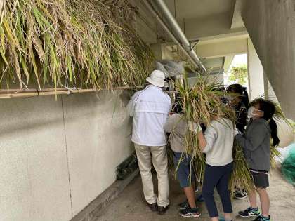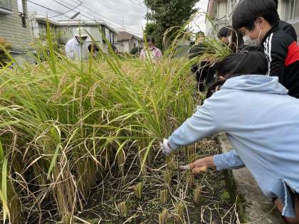 5年生は、総合的な学習の時間に、年間を通して米作り体験を行なっています。本日は、待ちに待った稲刈り。今年は豊作です。鎌で稲を刈り、束にしたものを干しました。2週間程したら、脱穀をする予定です。
