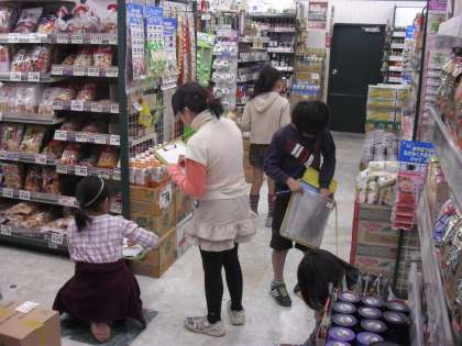 混雑する店内でお忙しい中、子どもたちの学習活動のためにご協力いただいたスーパーの方々に感謝します。
