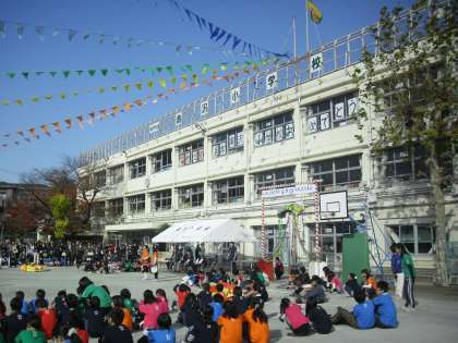 地域のかたのご厚意とご協力によって実現した、くす玉割りでは、地域の方と1年生の代表が一緒にリボンを引きました。これもまた鮮やかな飾りが温かな日差しと風に舞って美しい限りです。