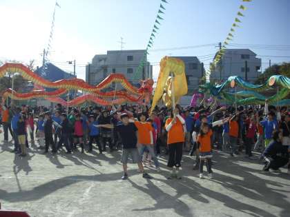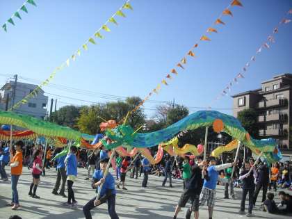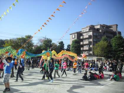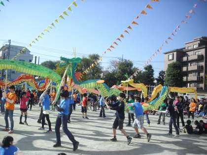 色鮮やかな大蛇たちは、校庭上空にはためく、手づくりの旗と一緒になって、お祝いの気分が高まります。
