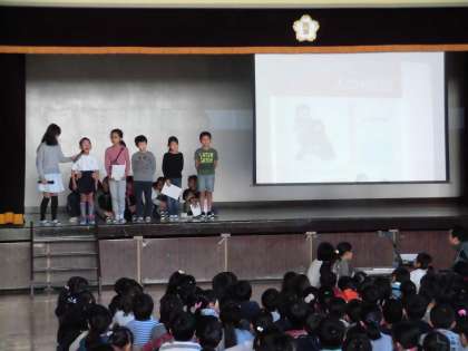 朝の時間に全校で、おすすめの本を紹介する図書集会が開かれました。1学期は2・4・6年生の代表児童が発表をし、今回は1・3・5年生の代表児童が発表を行いました。先日のコスモス読書週間で多くの本を読んだ中から選んだ1冊を紹介しました。発表を聞き、より多くの児童が更に読書の幅を広げてほしいと願っています。