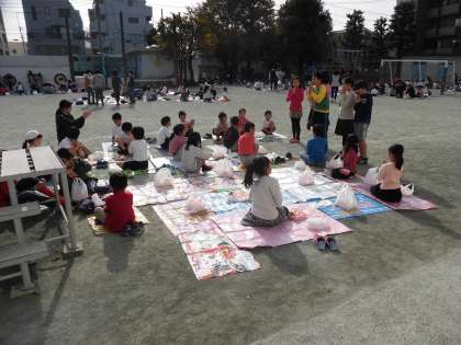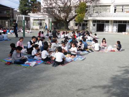 気もちのよい好天の下、縦割り班活動の一つである縦割り班給食を、校庭で実施することができました。そして、給食をつくる栄養士さんと調理師さんたちが、人気メニューの一つである唐揚げをメインにしたお弁当給食を用意してくださり、子どもたちは大喜びでした。お腹が満たされた後は、班で楽しく遊びました。いつも以上に盛り上がっている班もありました。