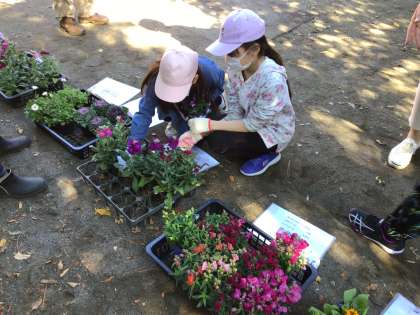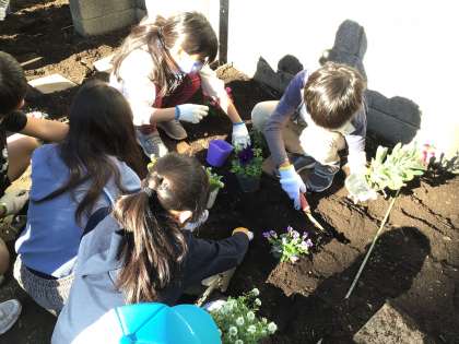 パンジーの苗とチューリップの球根を植えました。チューリップが伸びてくるまで、パンジーの花を楽しみながら、水やりをします。教室では、チューリップと同じく球根から育つヒヤシンスを育てています。根の様子も観察してほしいと思っています。
