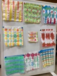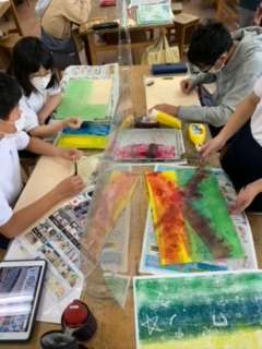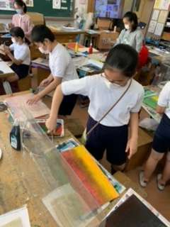 「ひびき合う形と色を求めて」はスチレンボードを使った版画です。彫り進み版画・回転版画・パズル版画の技法を使って、自分なりの作品づくりに取り組みました。インクの混色も工夫して、ステキな作品に仕上がりました。