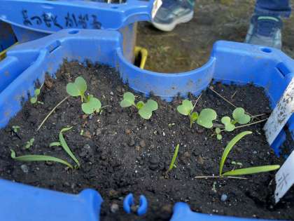 10月中旬に、生活科「秋からそだてるやさい」で、ホンレンソウとコマツナの種の植え付けをしました。3週間たって、芽は少しずつ育ってきています。