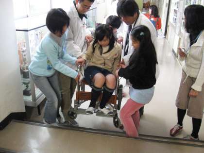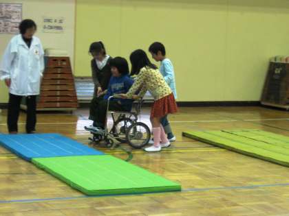 体育館の中にマットやとびばこのふみきり板などを置き、実際の道に見立て、交替交代に車いすに乗ったり、押したりしました。また、トイレまで行きましたが、途中の3段ほどの階段は大人の方にも一緒に持っていただきながら、移動の大変さを味わいました。