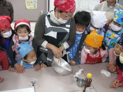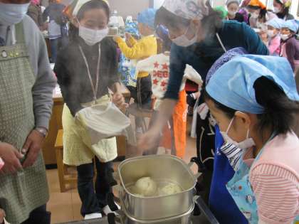 いよいよ肉まん作りです。始めに肉まんの皮の作り方を習いました。そして、グループに別れ、作りました。粉が手に着くのですが、だんだんにまとまっていきます。こねる手つきもなかなかのもの。1年生や2年生の子どもたちもまるでシェフのよう。