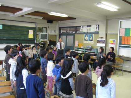 12月24日(木)4校時は1年2組とつくし、5校時は1年1組が音楽の学習のまとめとして、ミニコンサートを開きました。校長先生や普段お世話になっている先生方に招待状を贈り、招きました。「たんぽぽ」「虹」「空より高く」やクリスマスソングも含め、各クラスとも全部で10曲くらい披露しました。明るく元気な歌声で先生たちも一緒にタンバリンやすずを鳴らして、楽しみました。