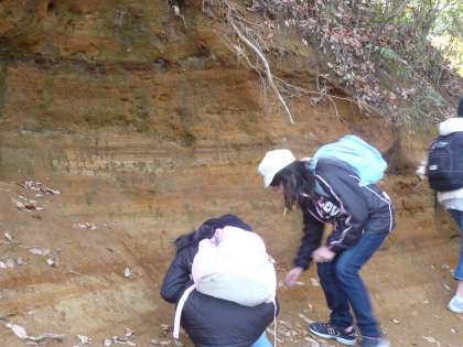 生田緑地には「日本民家園」があり、日本各地の古くからの家屋が展示されていて、歴史の勉強もできました。生田緑地にある枡形山は地層見学のモデルコースにもなっており、古い地層と新しい地層が重なり合う「不整合面」の特徴をよく見ることのできる最適な場所です。子どもたちは粘土の層や小石の混じった層を実際に触れてみて、何万年も昔の地球のつくりを知ることができました。