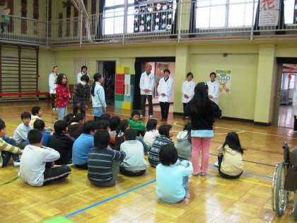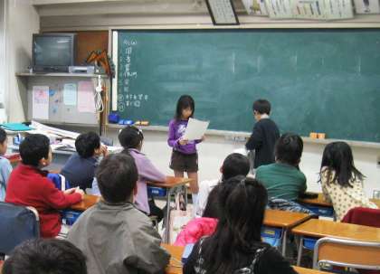 はじめに1組、2組のそれぞれの教室で出し物を見せました。劇をしたり、手品をしたりして楽しんでもらいました。