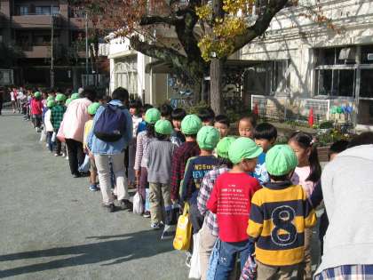 あっという間に1時間が過ぎ、終わりのご挨拶をし、1年生が1列に並び、保育園のお友達一人一人と握手をしてお別れしました。今度は1年生が奥沢保育園に行くお約束をしていました。