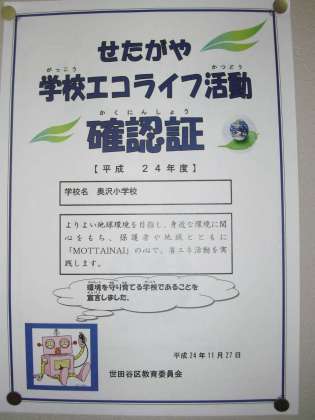 本校の せたがや学校エコライフ活動について「活動推進宣言書」を受け取ったとの確認証になります。