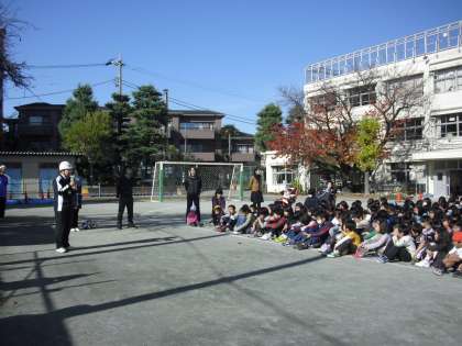 校長先生の講評で、「もし火事を見つけたら、大きな声で『火事です!』ということ」「今までの訓練を意識して行動できたか」「お・か・し・もの約束をしっかり守ること。それが自分の命を守ることにつながる」というお話がありました。