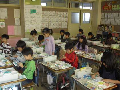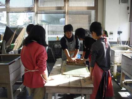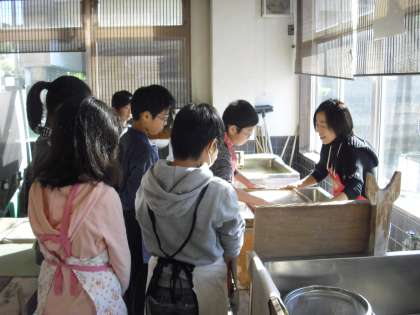 6日は2組が、7日は1組が区内の山崎小学校に、紙漉き体験に出かけました。