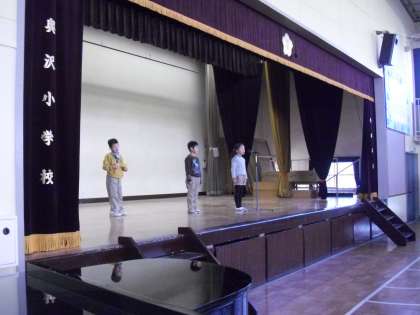 代表児童は1年生とつくし学級でした。3人はそれぞれ自分の言葉で落ち着いてしっかり話すことができました。全校児童も静かに3人の話に耳を傾けていました。