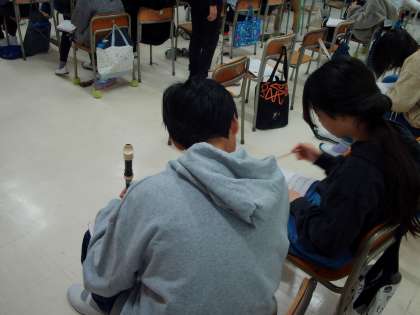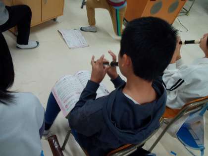 5年生が音楽の授業で、「威風堂々」をリコーダーで演奏しています。これは卒業式で演奏する曲です。難しい旋律の指使いを一生懸命に練習し、1小節できるととても嬉しそうでした。少しずつ上達して、きっと卒業式では、6年生を立派に見送る演奏ができることと思います。