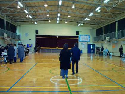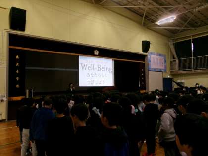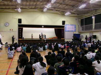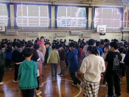 今日は朝の時間に、集会委員会の児童が中心となって、たてわり児童集会を開きました。体育館に全校児童が集合し、たてわり班ごとにじゃんけんゲームをしました。各班の6年生と下級生がじゃんけんをするゲームです。6年生が下級生たちを優しくリードしてくれたおかげで、みんな楽しく活動することができました。