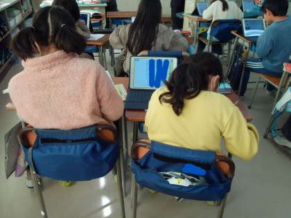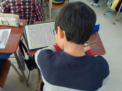 4年生は国語の学習で、伝統工芸品のパンフレット作りをしています。パンフレットがどんな構成になっているかや、どんな情報が必要かなど、これまでに学んだことを生かして、実際に自分でパンフレットを作っています。下書きを学習用タブレット端末で作り、清書は手書きをしていました。タブレット端末上に下書きをすることで、手軽に訂正ができます。効果的な使い方ですね。あと1時間でパンフレットづくりが完成します。出来上がりが楽しみですね。