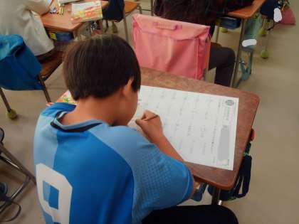 2年生は、まとめの学習で漢字の確かめをしていました。何度も同じ問題に挑戦し、解き直しをしています。「80点をとったんだよ!」と嬉しそうに報告しながら、もっと完璧に習った漢字を覚えられるように、再度挑戦していました。隣の友達が「100点をとった子もいるんだよ。」と教えてくれました。