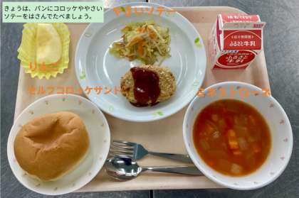 今日は給食室で手作りしたコロッケや野菜ソテーをパンにはさみます。