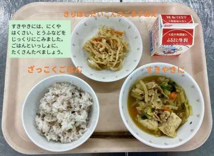 すきやき煮は、肉や豆腐、白菜・春菊などを砂糖やしょうゆで