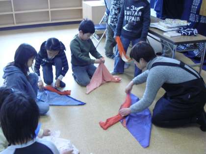 平成23年2月17日、保護者やNPOの方々のご協力をいただき、3年生が風呂敷を使って様々なものを包む学習をしました。