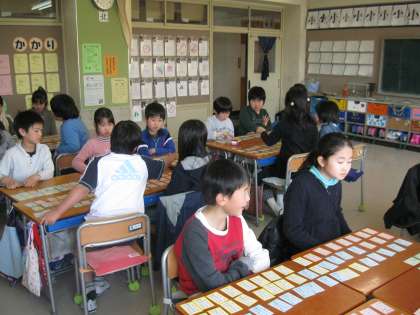 3月11日(木)3年生と4年生が合同で百人一首大会を行いました。3年1組と4年2組、3年2組と4年1組がそれぞれの教室に分かれて、対戦しました。