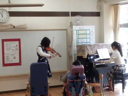 つくし学級児童の卒業を祝って、本校の卒業生がコンサートを開いてくださいました。やさしいピアノとバイオリンの音に包まれて、みんなで卒業を祝いました。お二人からの、卒業生、在校生への言葉に、勇気をいただきました。講師の先生も、トランペットで、つくし学級の子どもたちと一緒に今日まで歌ってきた曲を演奏してくださいました。もうすぐ、卒業です。