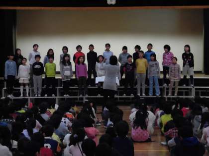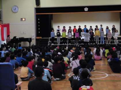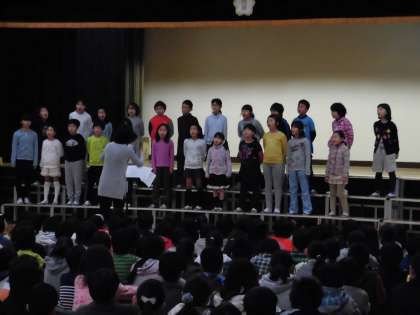 3/10(木)の音楽朝会で、合唱団の今年度最後となる発表が行われました。合唱団の人数としては決して多くない約20名の子どもたちでしたが、人数以上に感じる歌声が体育館中に響き渡りました。そのような力が発揮できたのは、この1年の練習の成果でした。目標に向かって一つのことを成し遂げたことは、今後にも生きてくることでしょう。また、観覧した子どもたちの鑑賞態度も大変すばらしかったです。