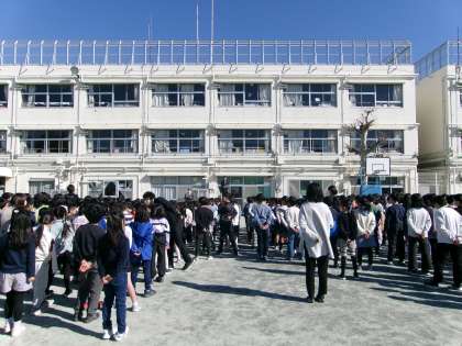 今日の避難訓練では、防災訓練を行いました。地震が起こったとき、まずは自分の身を守る行動をとるため、どのようなことをすればよいかを放送で紹介しました。さらに、東日本大震災のときに本当にあったことをアニメーションで見るなどして、避難の仕方についても再度考える機会となりました。また、学校長からは、東日本大震災で被災された方々の中には、13年経った今でも、不自由な生活をしている方々がいらっしゃることを伝え、3月11日を迎えるにあたり、東北地方に思いを馳せてほしいと話しました。