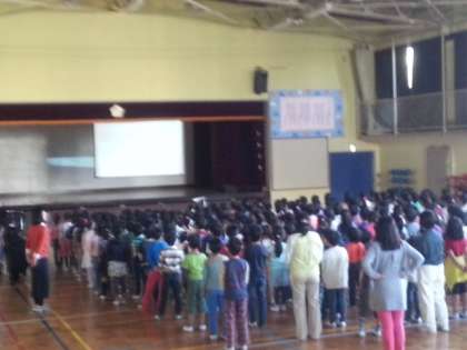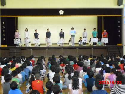 2・3・4年生が、1年生と一緒に校歌を歌いました。1年生が、早く校歌を覚えられるようにと、歌詞がはっきりと伝わるように歌いました。1年生からも、しっかりした声が聞こえてきました。