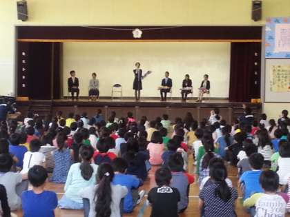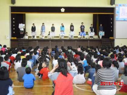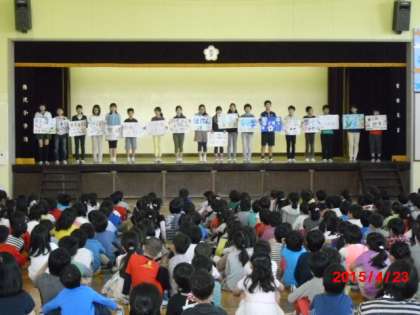 4月22日木曜日の第1回児童集会で、今年度各委員会・クラブの委員長さん・クラブ長さんの紹介が体育館で行われました。この1年、大切な活動をリードする人たちです。一人ひとりが全校児童の前で、この1年の抱負やみんなにお願いしたいこと、各委員会・クラブのよさなどをしっかりと述べていました。