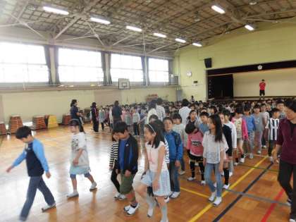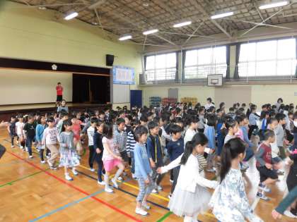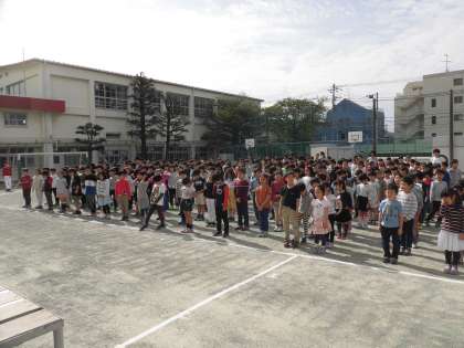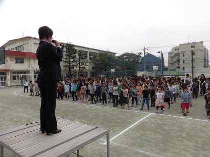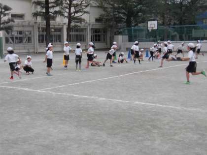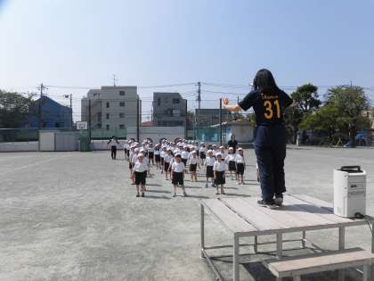 1年生は、校庭で先生の動きを見て運動ができるようになりました。