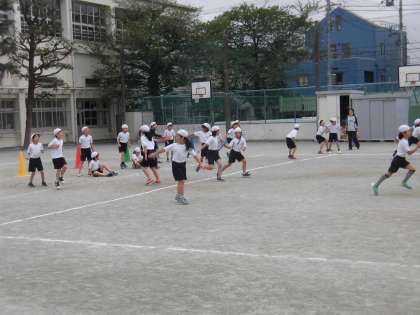 勢いよく走りながらバトンを渡すには、どうしたらよいか考えながら運動していました。 -